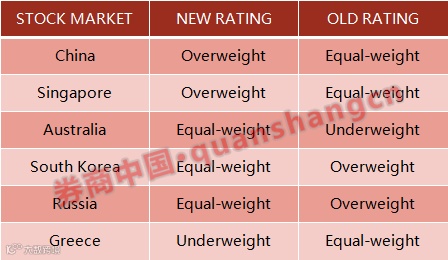 3月1日,摩根士丹利调高了中国、新加坡和澳大利亚的股市评级,目前,中国和新加坡股市的评级由持有(Equal-weight)上调至增持(Overweight),澳大利亚股市的评级由低配(Underweight)上调至持有(Equal-weight)。