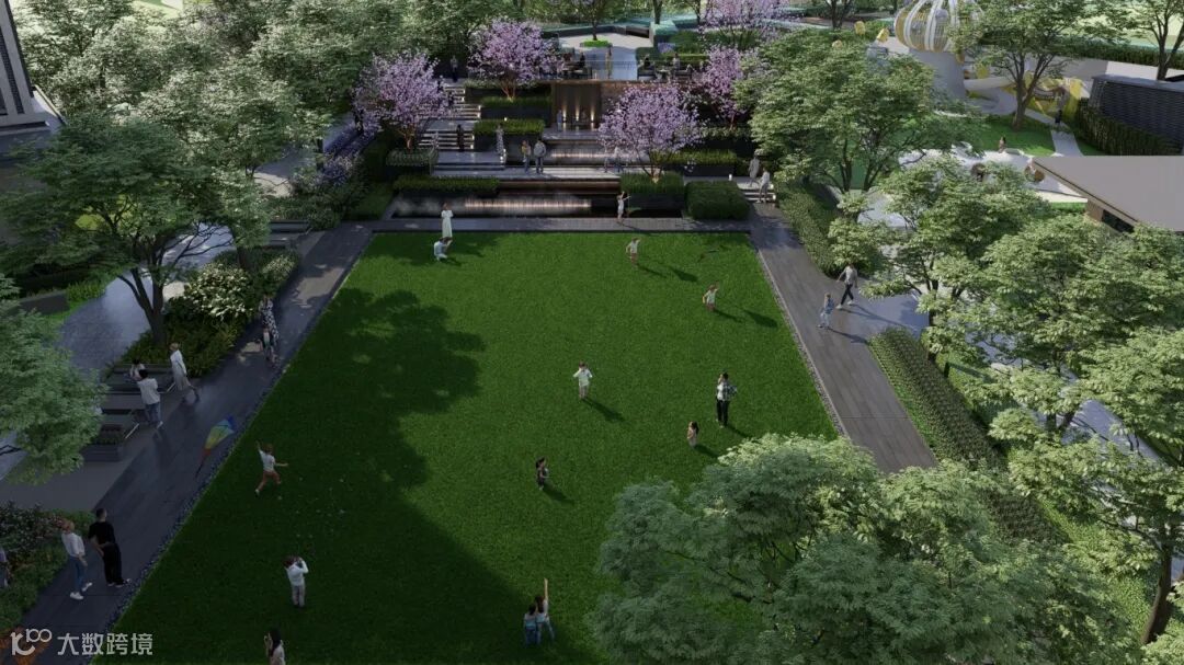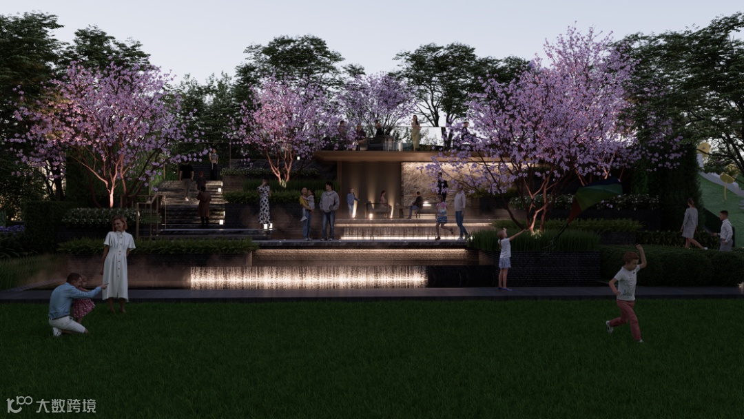 以林荫树阵和阳光草坪为核心,利用原有地势地貌的高差,打造一个可游、可观、可赏、可憩等多维互动立体空间。
