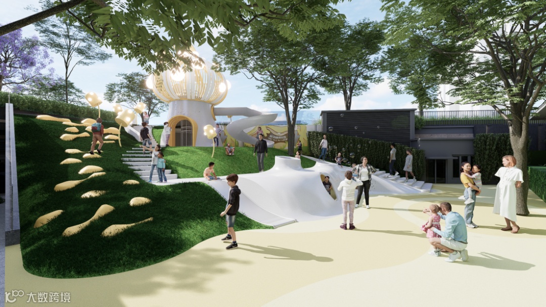 于此,一边看着小孩在阳光草坪上奔跑、放风筝,一边拾阶而上,移步异景,享受亲子互动的多彩陪伴时光。