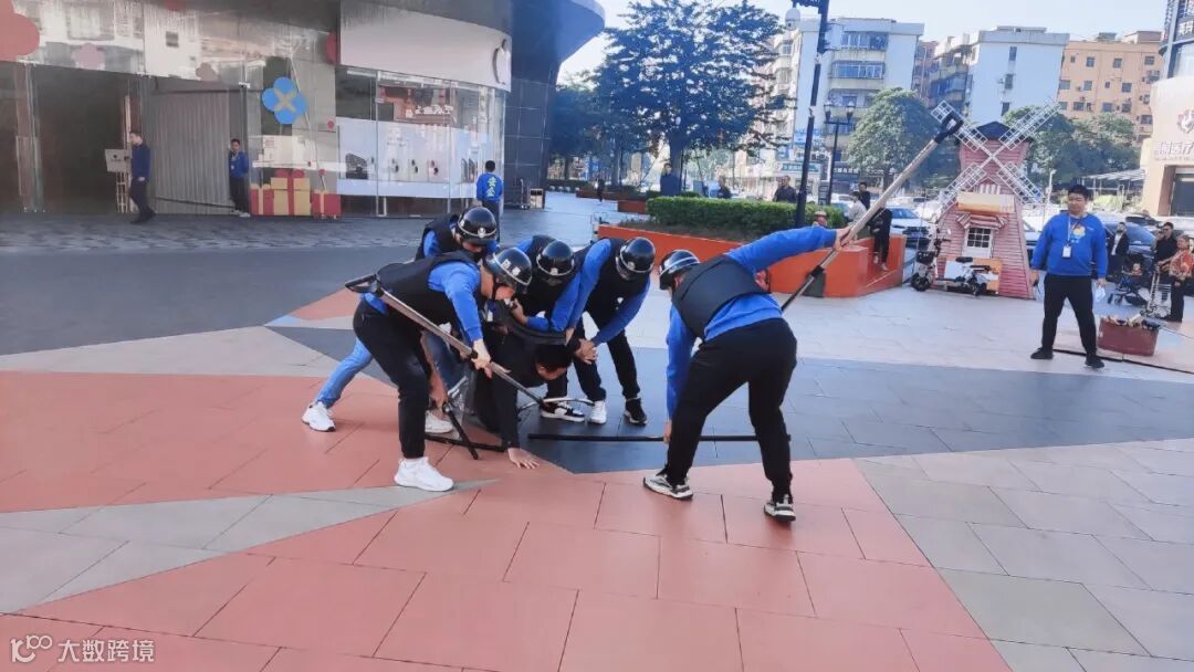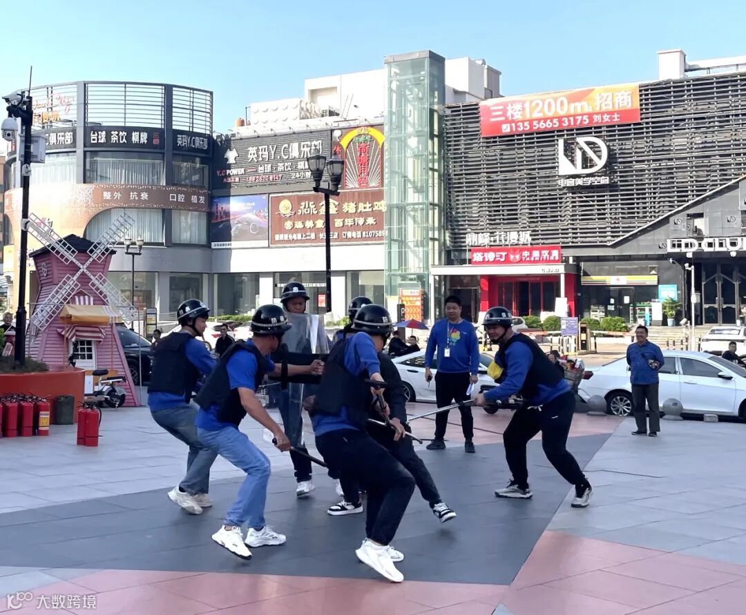 进入防暴恐演练环节,花漫城商业物业主管蒋瑞宝向大家讲解盾牌、钢叉、长棍等反恐防暴器具的使用方法和技巧。现场模拟一名“歹徒”持刀闯入商场,工作人员立即响应,针对现场情况,果断采取有效措施,运用防具、盾牌进行灵活处置,抓准时机,成功合力将“歹徒”制服,并及时拨打110报警。