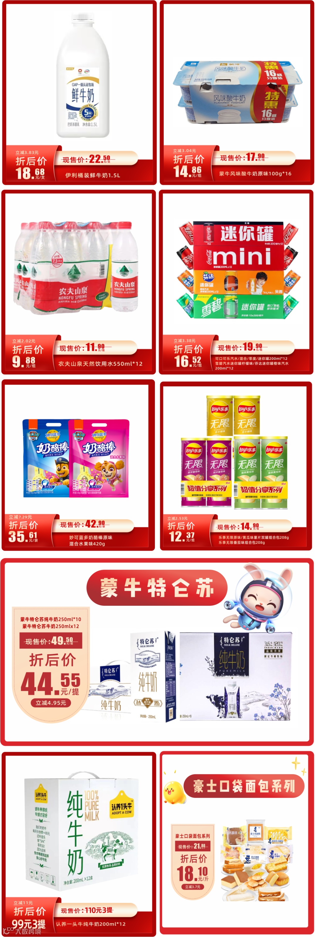 大小朋友都爱逛的零食区,N+款零食、饮料、乳品怎能错过呢。快乐肥宅水、嘎嘣脆的薯片、小面包,爱吃什么拿什么,花得少,选择多,关键是划算~