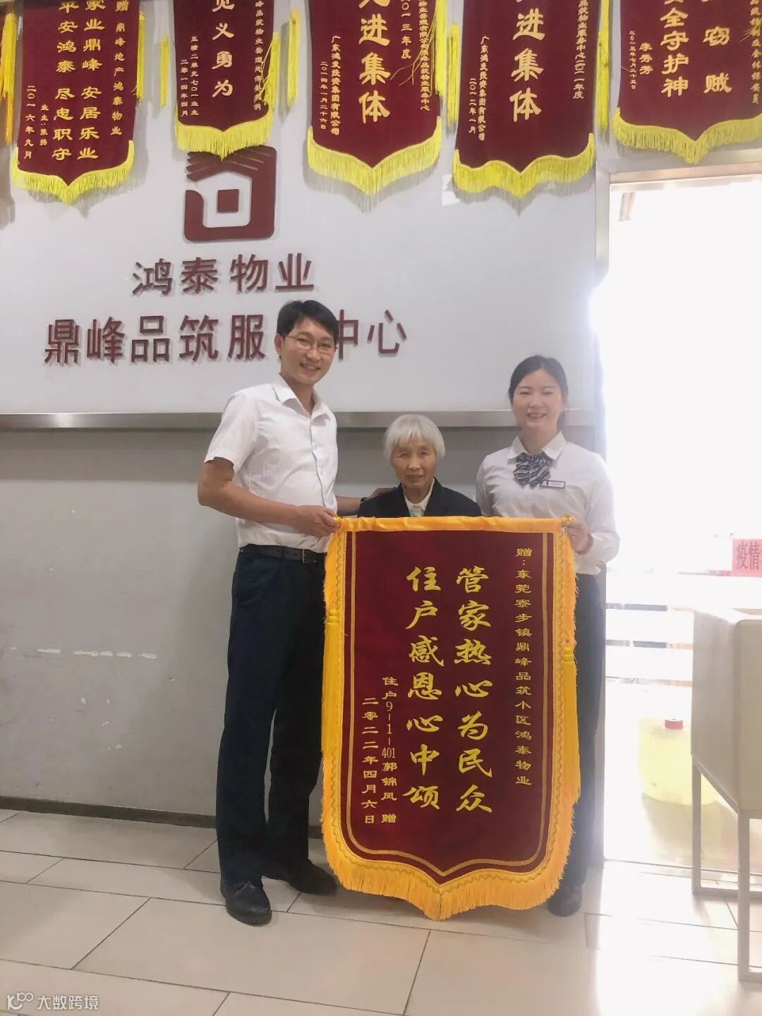 4月6日,杨奶奶在康复后亲自来到鼎峰品筑物业服务中心为客服管家张海芳、客服管家叶渭鹏送上锦旗,以示感谢。