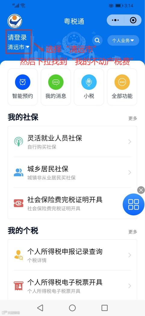 2、选择”清远”地区后,下拉找到“我的不动产税费”并点击进去。