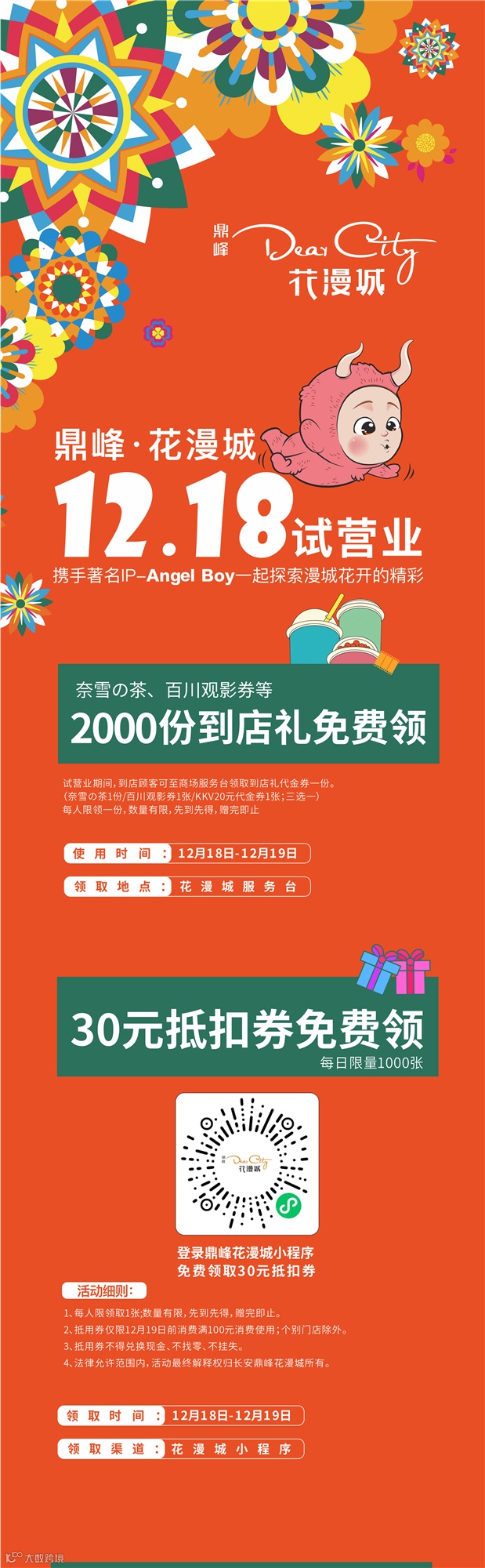 感谢您对鼎峰花漫城一直以来的关心与支持。因近期疫情突发,鼎峰花漫城原定于12月18日举行盛大开业。现配合上级疫情防控要求,原定开业改为试营业。原计划开业活动如明星乐队演出、儿童音乐剧目、巡游、抽奖等聚集性活动将延后开展。具体时间以官方发布为准。