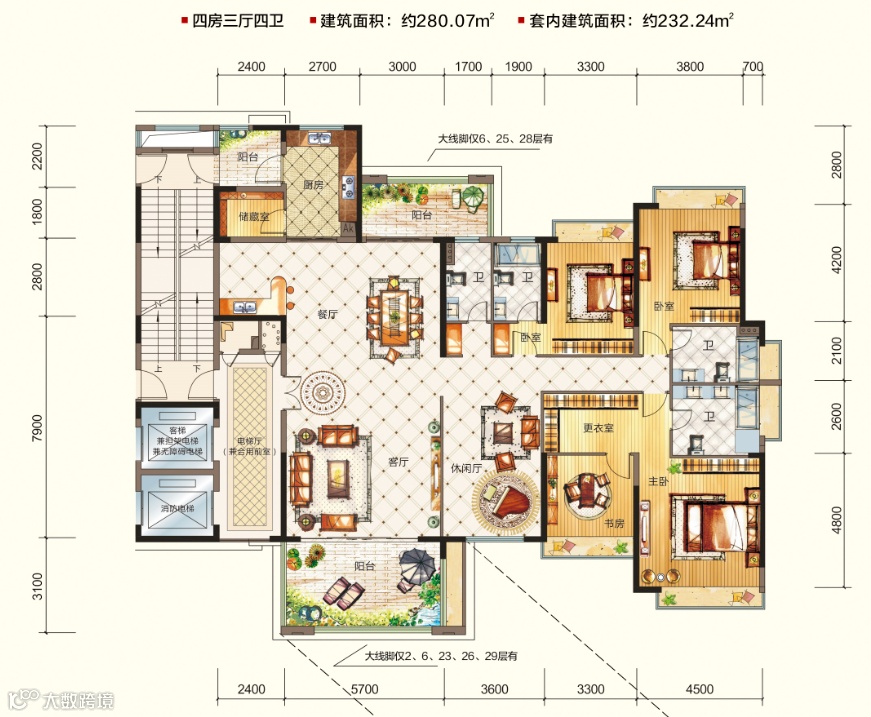 卧室和起居室的动静分区明确,三个卧室均为套房设计,带独立卫生间和大面积飘窗。