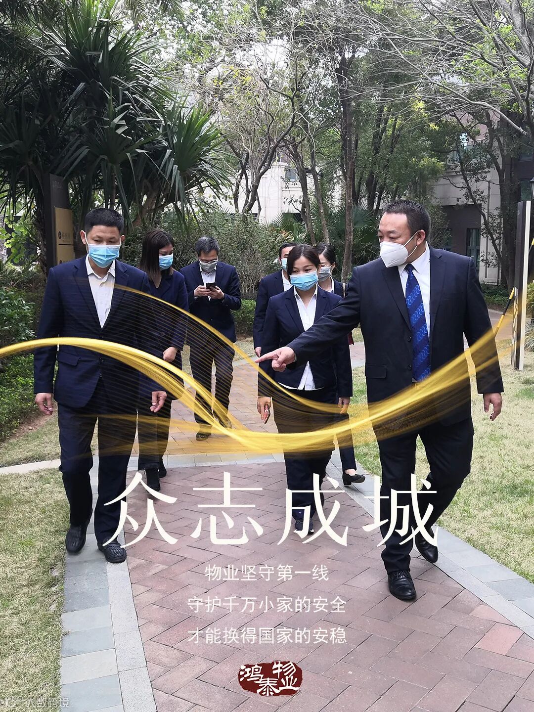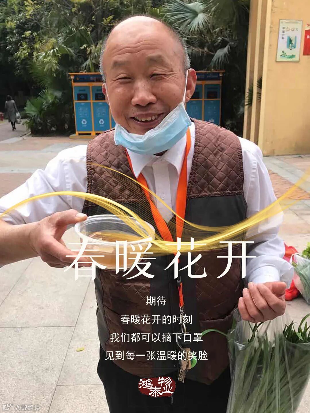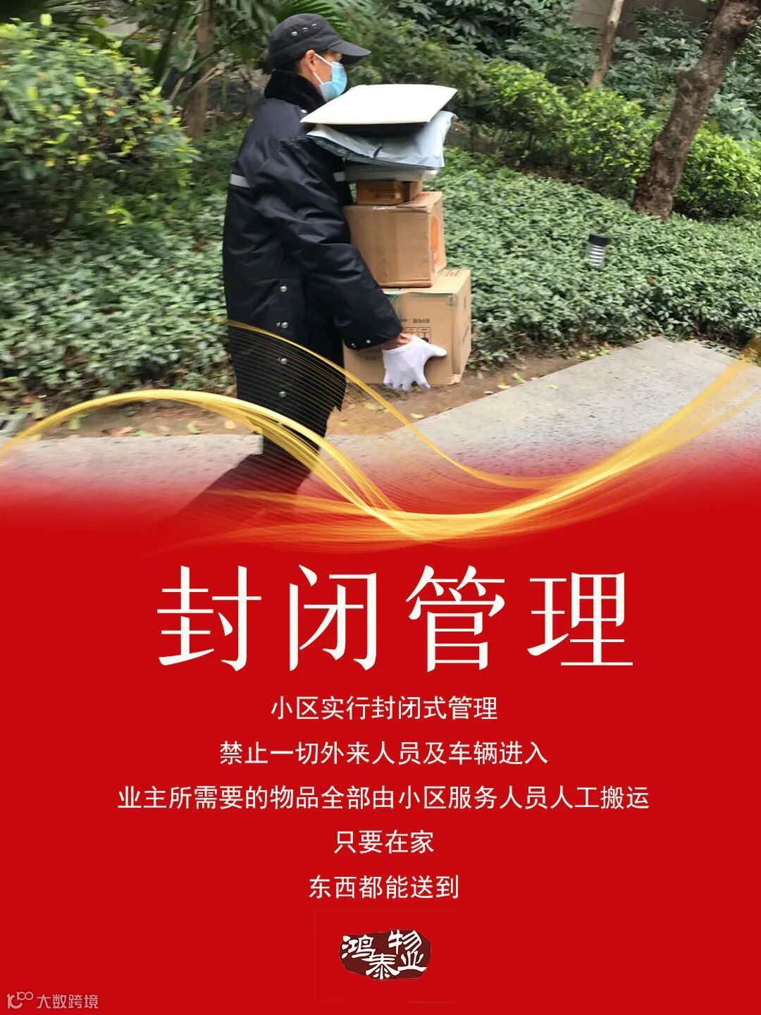 只有一副口罩和一身鸿泰物业的工装