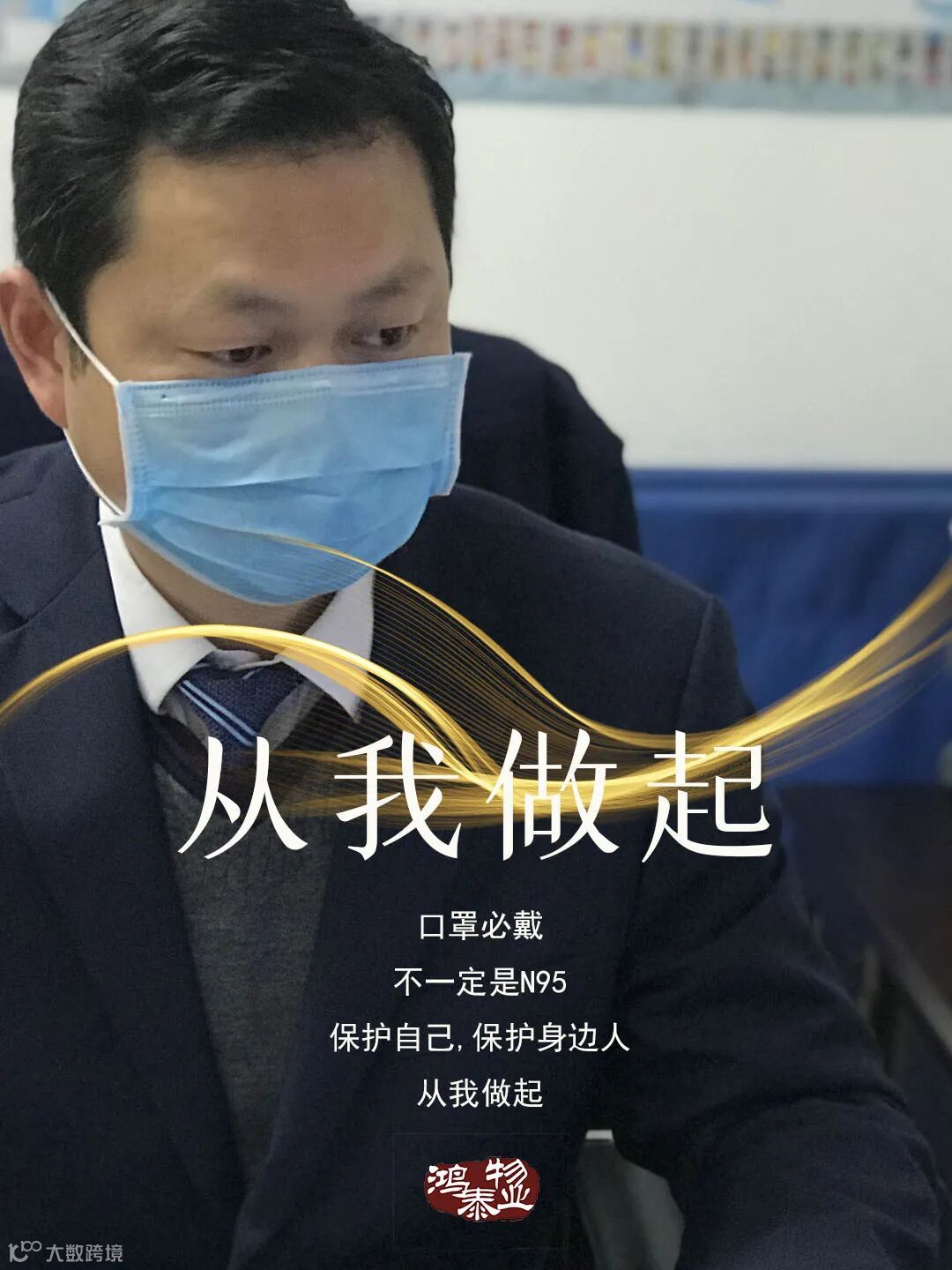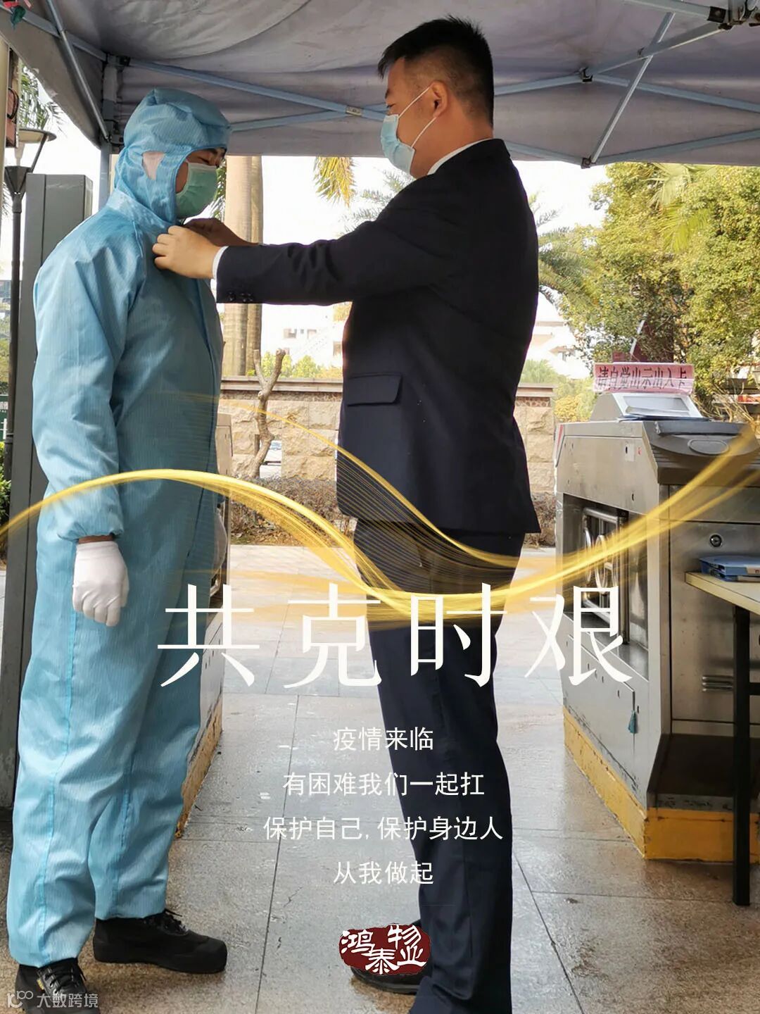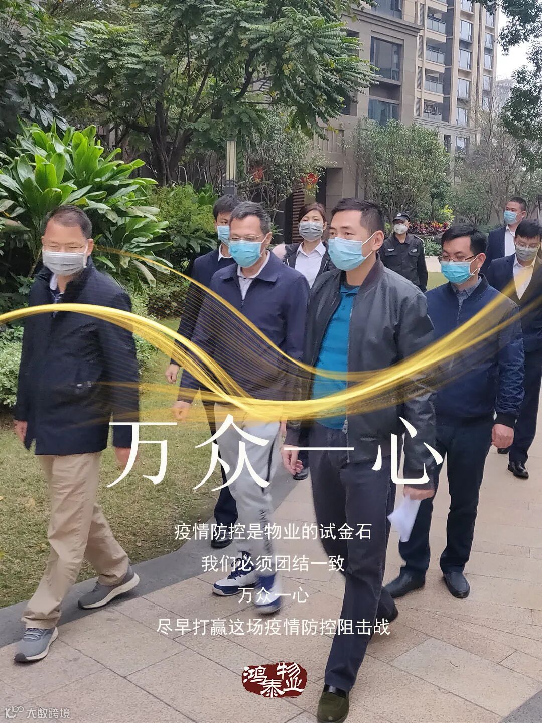 只有一副口罩和一身鸿泰物业的工装