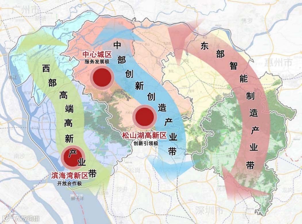 采取极点带动、三带支撑、区域联动的空间发展思路,以松山湖高新区创新引领极、中心城区服务发展极、滨海湾新区开放合作极构造黄金三角发挥辐射带动作用。