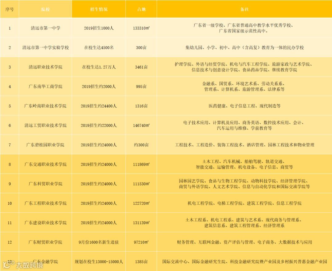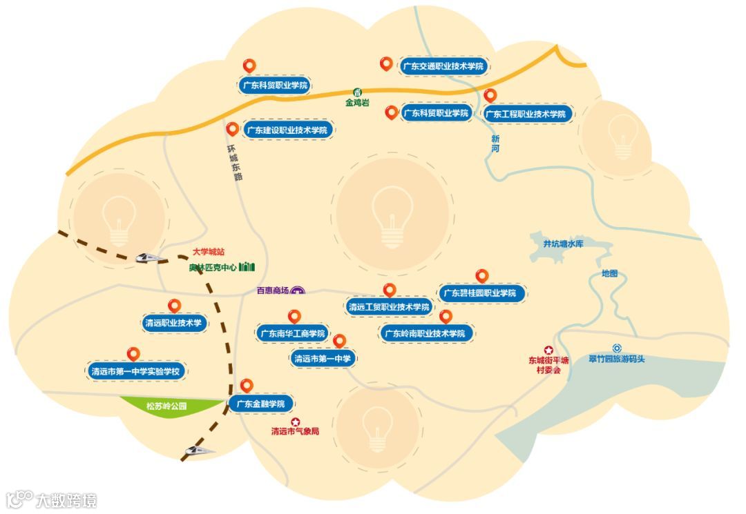 2002年,政府在东城落子清远首个大学城,2011年,“省级职教基地”获批建设,大学城再添新头衔。经过十多载的积累发展,凭借自身优势条件和强大生命力,产生巨大的虹吸效应,大学城迅速壮大自成一个板块。目前,大学城内已有院校7所,2019年秋季又将有5所高职院校迎来开学季,第一所本科院校广东金融学院也于6月份动工,人口可达10万之众。