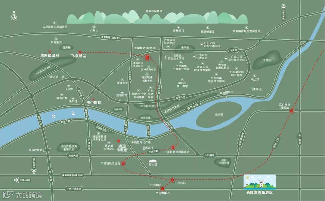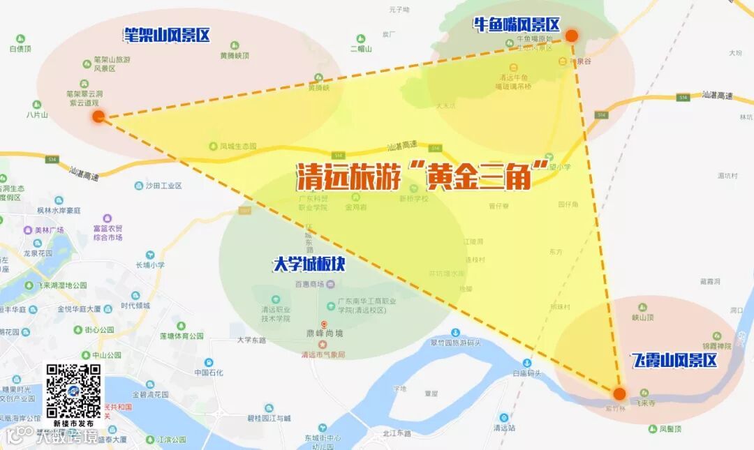 牛鱼嘴、笔架山、飞霞山三大风景区组团辐射,形成清远旅游“黄金三角”,三点间连线贯穿金鸡岩、黄腾峡等热门景点。而大学城板块,恰恰位于“黄金三角”的核心圈。从“黄金三角”核心圈出发,经北江四桥、旅游大道,直达银盏长隆度假区,再经许广高速,联通花都文旅城,形成一条广清旅游黄金轴!