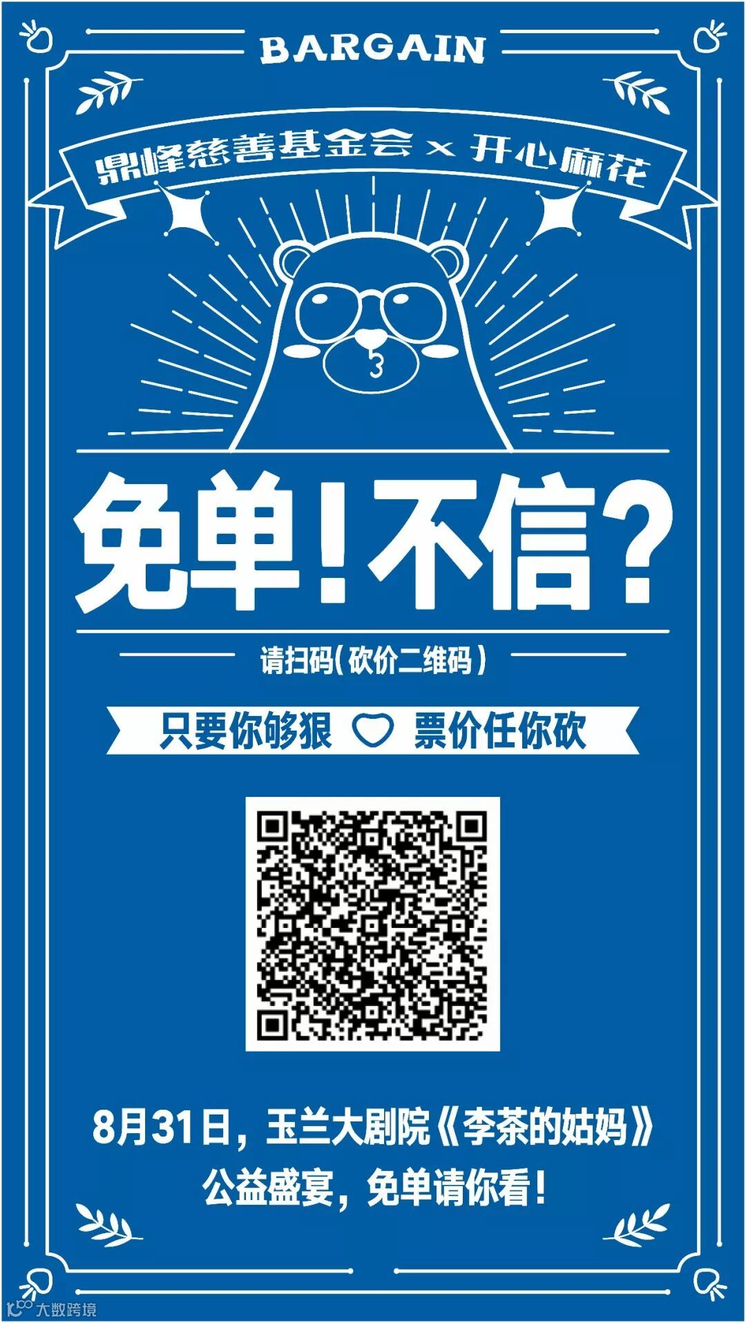 为让东莞街坊现场感受《李茶的姑妈》爆笑舞台剧气氛,助力鼎峰公益,鼎峰慈善基金会启动砍价免费抢票福利,只需关注以下二维码,即可轻松砍价,免费看开心麻花。