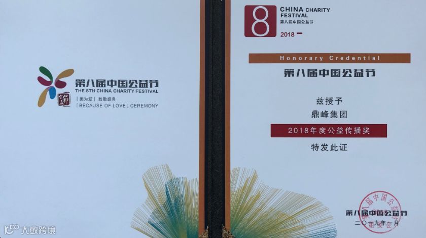 2019年1月15日,为期两天的第8届公益节在京闭幕,吸引了来自公益界、商界、学界、传媒及文化艺术等领域的千余名公益代表出席。期间,针对“科技公益、精准扶贫、教育公益、互联网公益、企业社会责任”等议题进行了分享与探讨,揭晓了年度人物奖、映像奖、项目奖、集体奖及单项奖等15个类别奖项,鼎峰集团荣获2018年度公益传播奖殊荣。