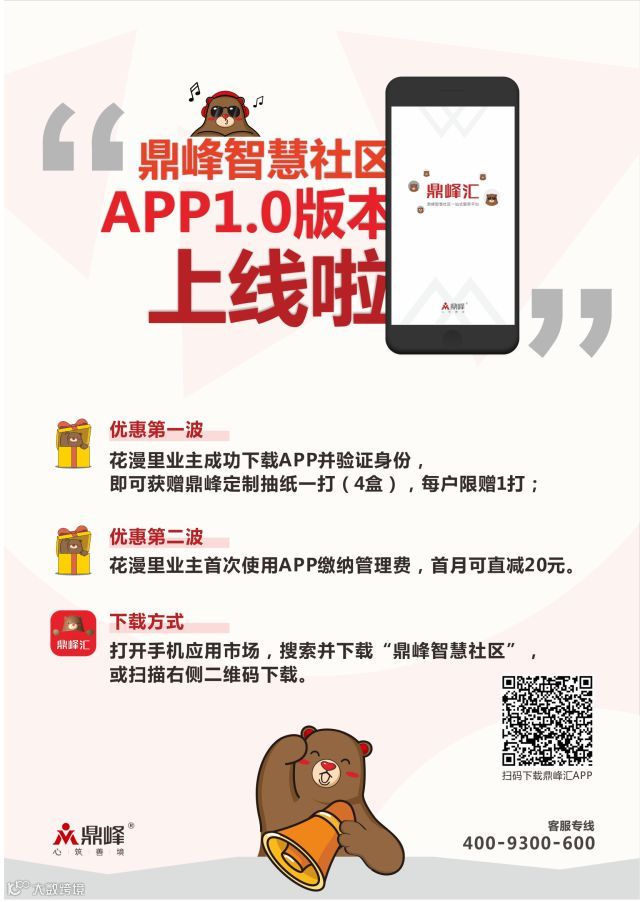 为了庆祝鼎峰智慧社区APP在鼎峰花漫里项目首次上线,现针对花漫里业主推出系列优惠活动(活动截止时间为2018年5月15日)