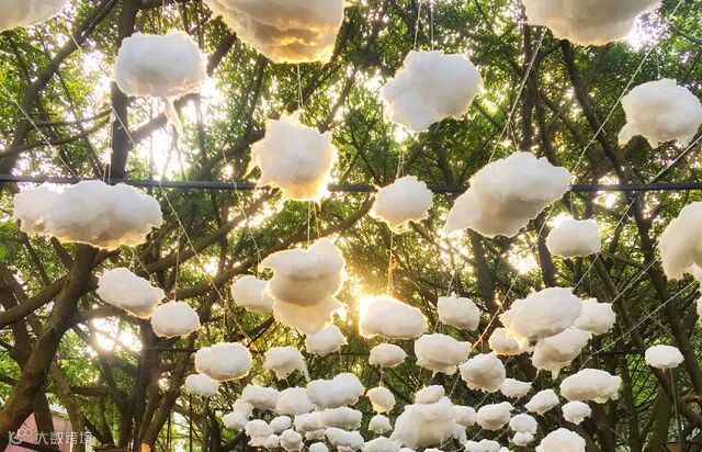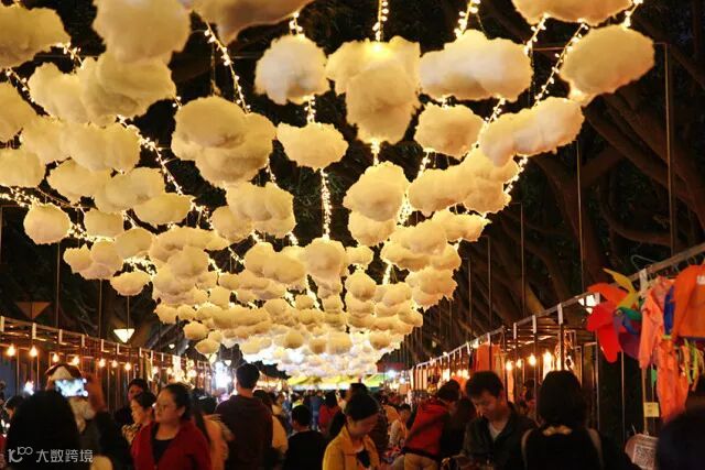 每一届集市,古榕大道都是一个绝美的亮点。本届主题为“白云天空”,与第一届的彩虹伞、第二届的星光大道一样,其唯美的视觉效果让前来赶集的市民纷纷拍照留影大晒朋友圈。“云朵天空”由不同大小的棉花配合暖黄色的灯光组合而成,白天在阳光的照射下仿佛镀上一层金边,洁白中透着无限诗意;夜晚在灯光的映照下则美轮美奂,让赶集的人仿佛身处梦幻之境。