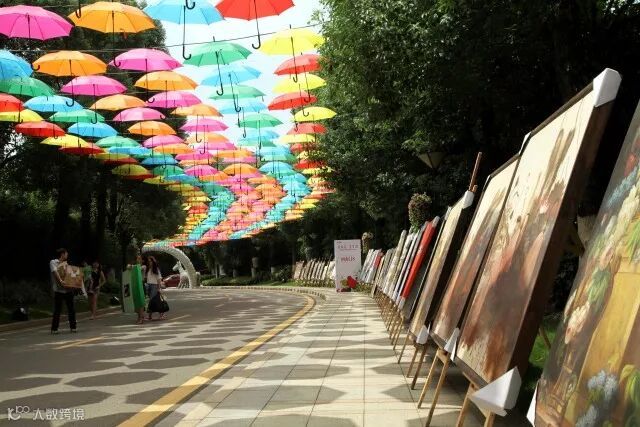 七色彩虹:七色雨伞形成的七色彩虹悬于古榕大道上空