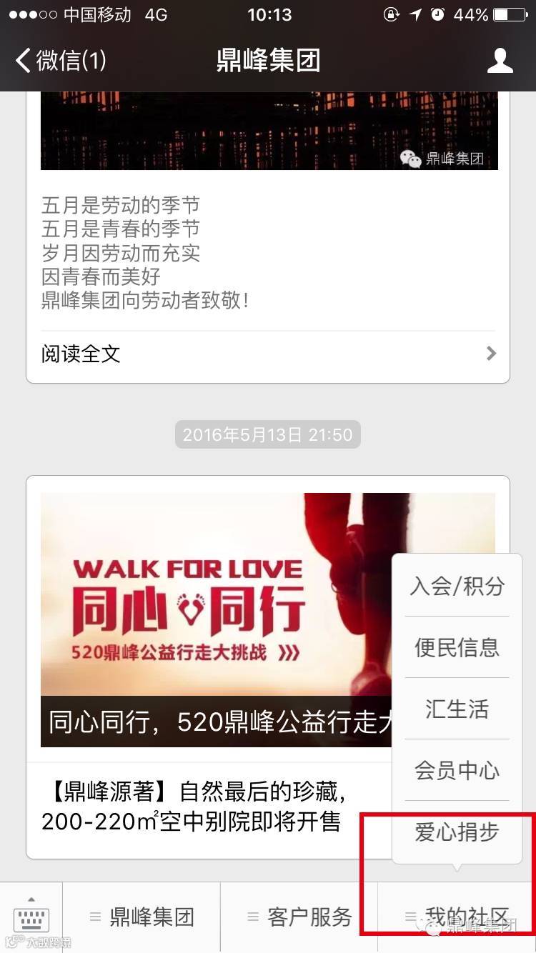 第二步:关注鼎峰官方微信,并进入主题页面“爱心捐步”