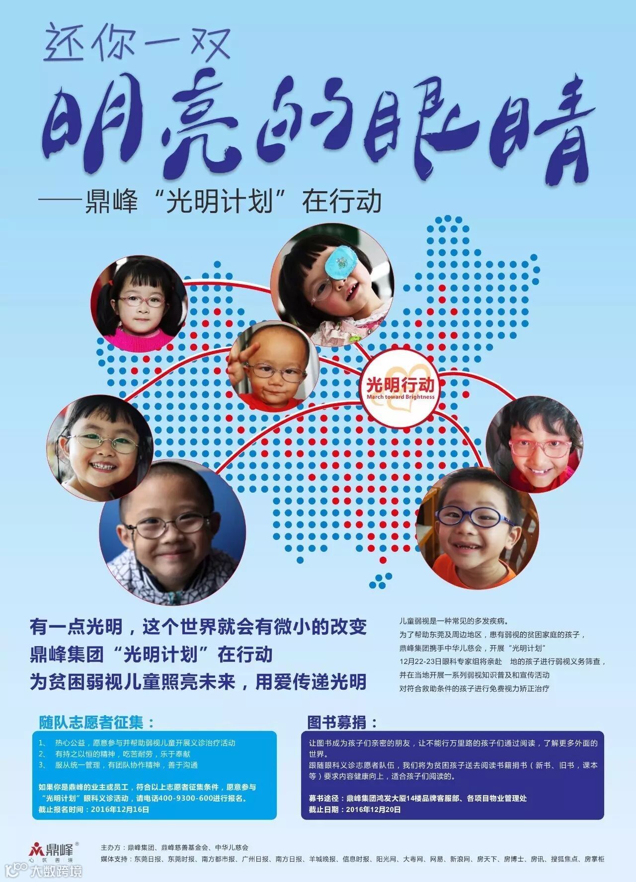 为了帮助东莞及周边地区,患有弱视的贫困家庭的孩子,鼎峰集团携手中华儿慈会开展“光明计划”,12月22-23日眼科专家组将亲赴清远佛冈,为孩子进行弱视筛查,并在当地开展一系列弱视知识普及和宣传活动,对符合救助条件的孩子进行免费视力矫正治疗。