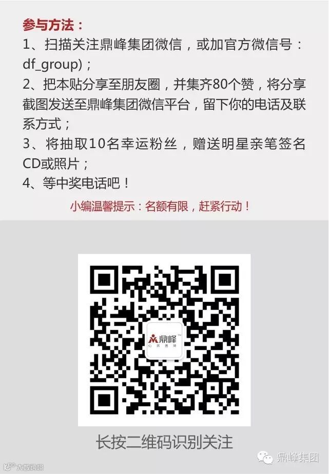 只要您关注鼎峰集团官方微信(微信号:df_group,就有机会获得阿兰、沙宝亮、王铮亮的签名CD和照片哦。数量、名额有限,赶快关注微信吧!小编我可是挤破头了,才抢到的,是亲笔签名哦。