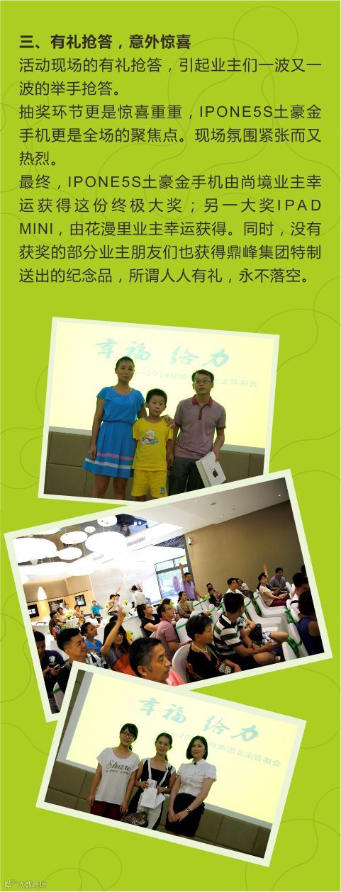 答谢会已完美落幕了。鼎峰集团非常感谢各位业主在2014年老带新政策的给力和支持,大力积极地介绍亲朋好友,为鼎峰集团贡献一份力量,也为他们提供一个家的选择和品牌信心的保证。