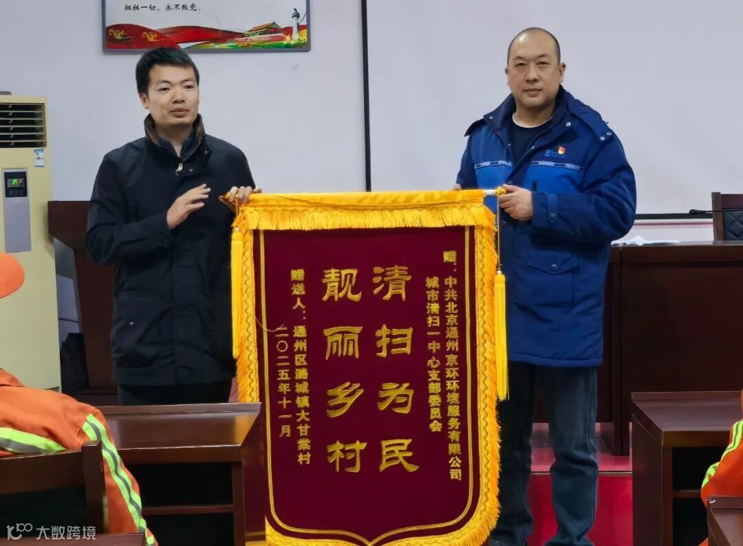 活动当天,一中心党员和大甘棠村党员志愿者、环卫人员一起清理篮球场、活动舞台、走廊过道、墙角缝隙……每一处卫生死角都不放过,每一片零散落叶都应收尽收。与此同时,一中心的大型洗地车在村内道路进行深度清洁,高压水流冲刷路面尘垢,实现车过路净。大甘棠村赠予一中心党支部一面写有“清扫为民、靓丽乡村”的锦旗,表达了对一中心党支部志愿服务精神的高度赞扬。