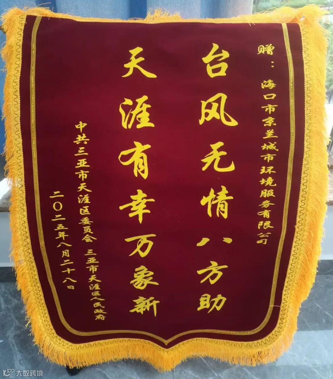 中共三亚市天涯区委员会、三亚市天涯区人民政府赠予海口京兰公司一面锦旗,送给海口京兰公司吴多信、符衡、刘刚、王秀娟等参与支援任务的职工一封感谢信。