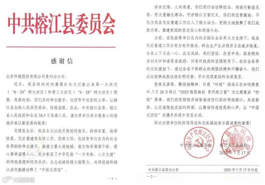 中共榕江县委员会、榕江县人民政府送给贵州分公司一封感谢信。贵州省镇远县住房和城乡建设局赠予镇远京环公司一面锦旗。