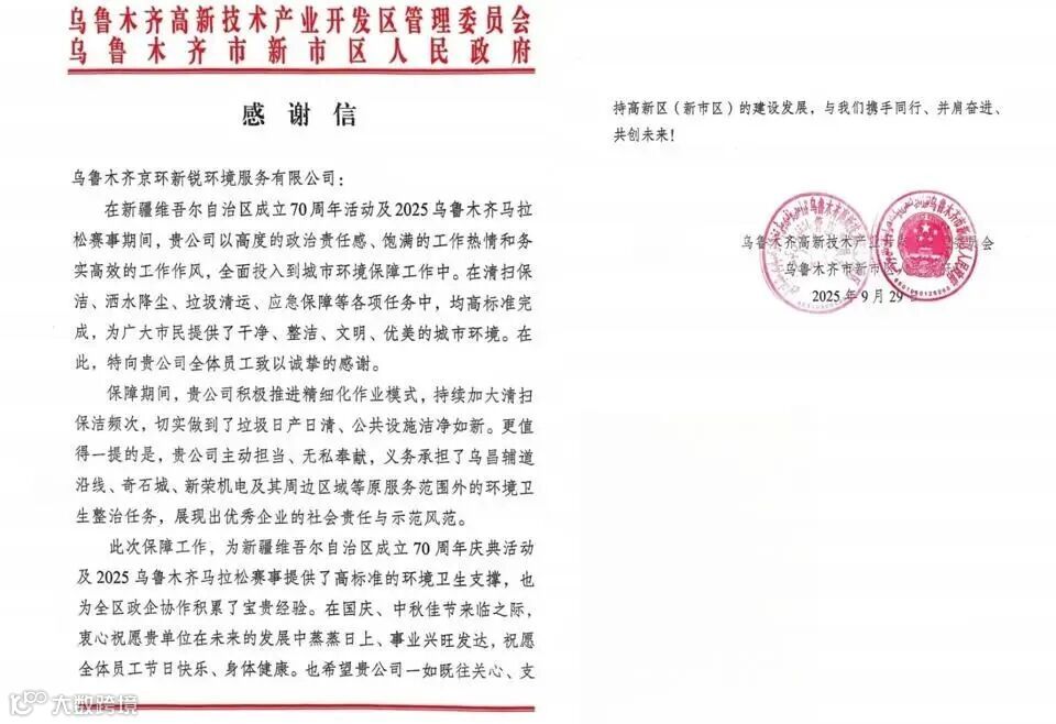 乌鲁木齐高新技术产业开发区管理委员会、乌鲁木齐市新市区人民政府送给乌鲁木齐京环新锐公司一封感谢信。