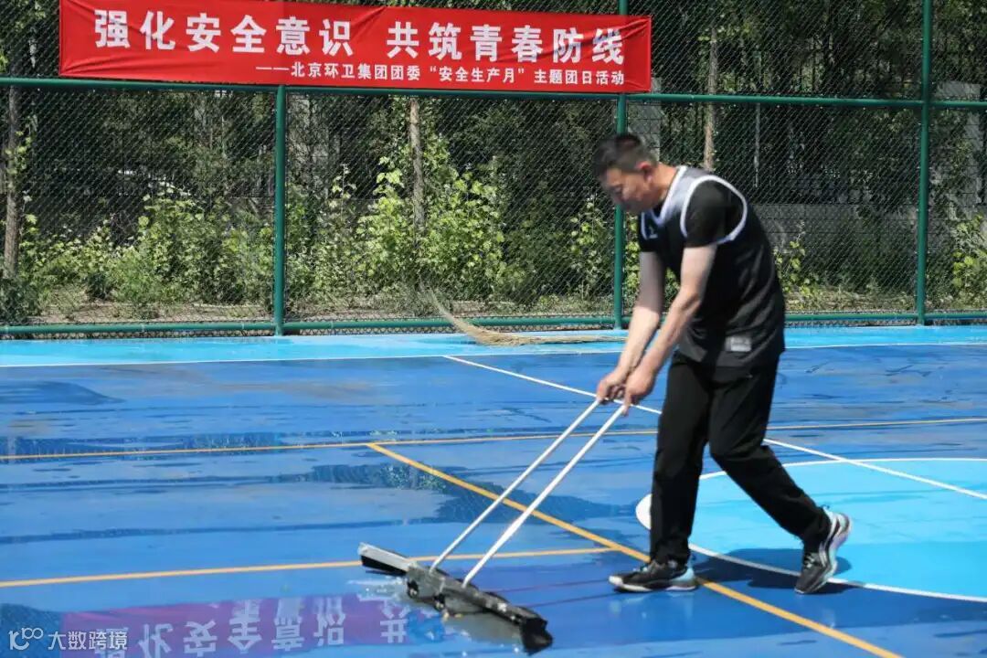 ▲团员青年对篮球及匹克球场地进行冲洗