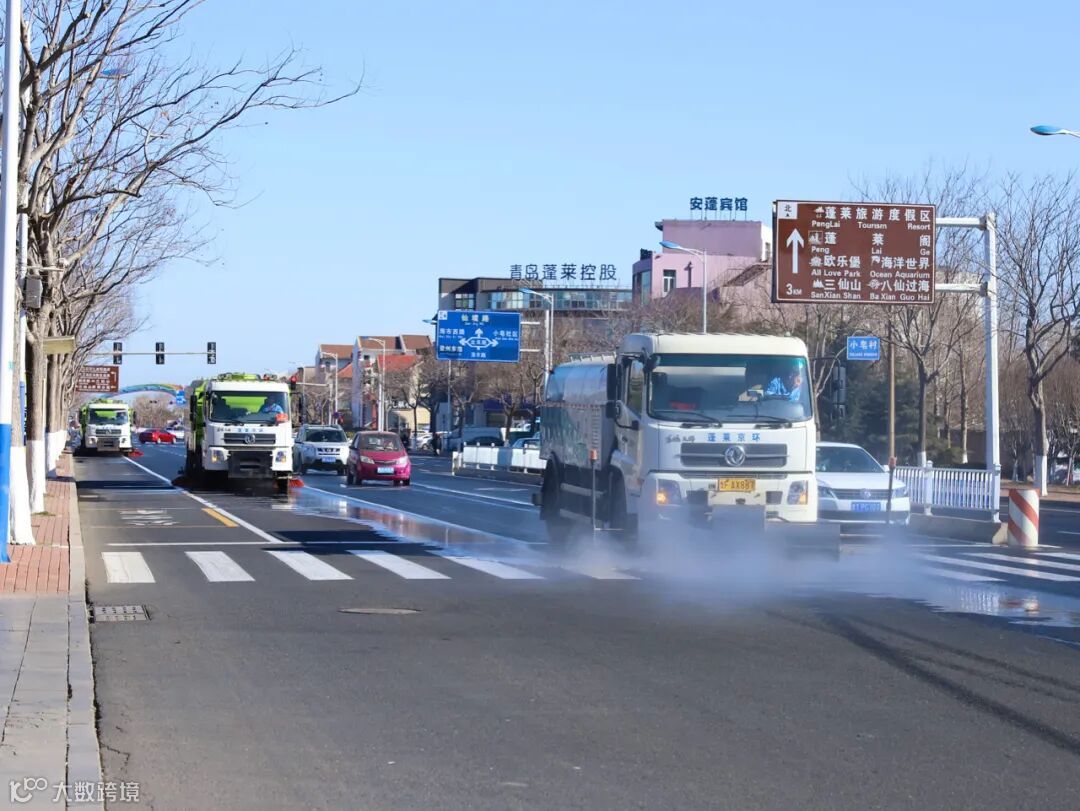 △在山东蓬莱,蓬莱京环公司车队正在开展道路作业,为居民、游客的出行保“洁”护航。(姜北摄)