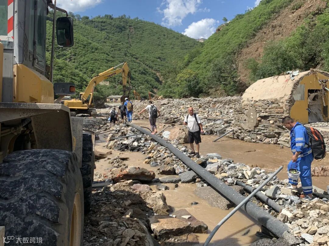 突击队先开皮卡车往山上走,沿途道路、房屋被洪水冲得满目疮痍。开到半道,路断了,剩下的路只能徒步前行。300多瓶水,100多斤的应急物品、药品及方便面分装在8个人的背包里。