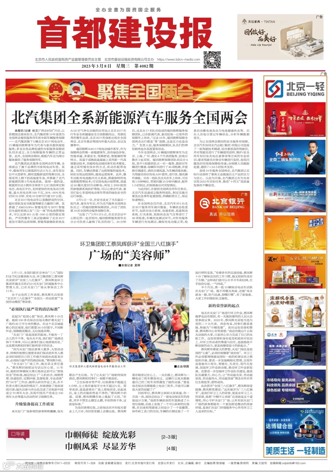 3月1日,全国妇联在京举办“三八”国际妇女节纪念暨表彰大会,环卫集团职工蔡凤辉光荣获评“全国三八红旗手”。蔡凤辉是环卫集团所属北京机扫公司天安门环境服务中心管理人员,已在天安门广场从事保洁工作11年。
