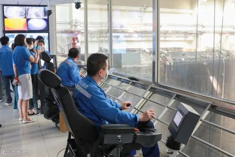 最后,参观人员来到垃圾吊操作室,观看垃圾吊从35米深的垃圾储坑抓取垃圾,投入料仓的过程。