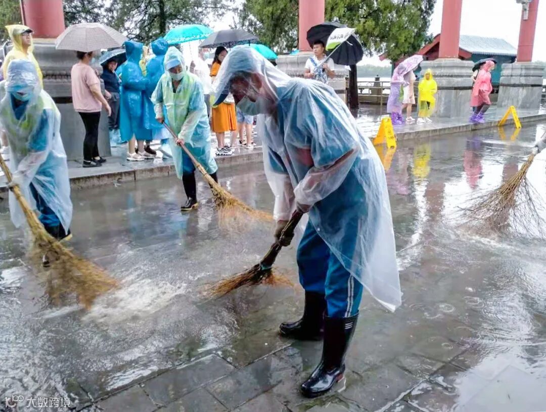 雨势较大时,大批游客滞留在颐和园长廊避雨,造成长廊垃圾量激增。针对此现象,中心调整作业工艺,在长廊沿线区域增加了作业频次,保洁员一手拿袋子,一手拿夹子,对垃圾进行快速捡拾收集,确保长廊干净整洁。