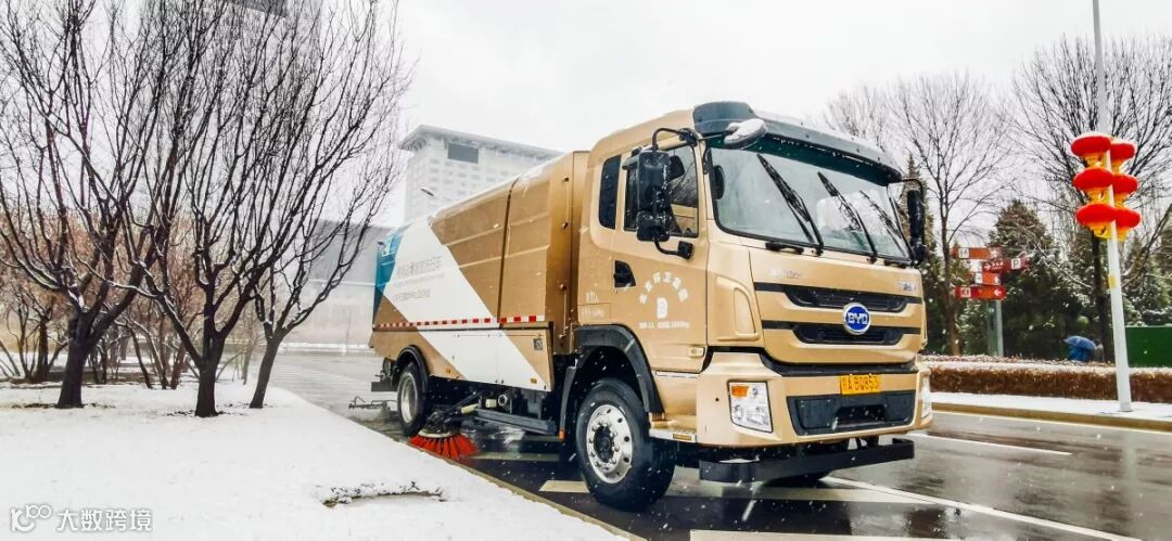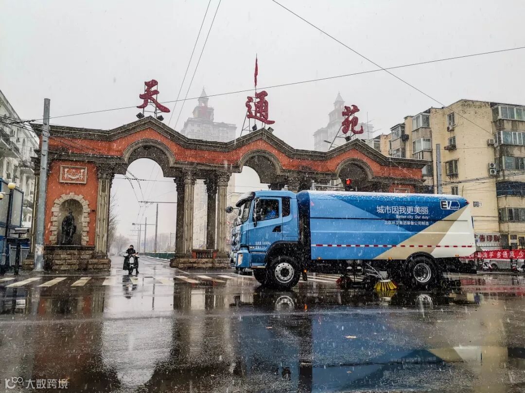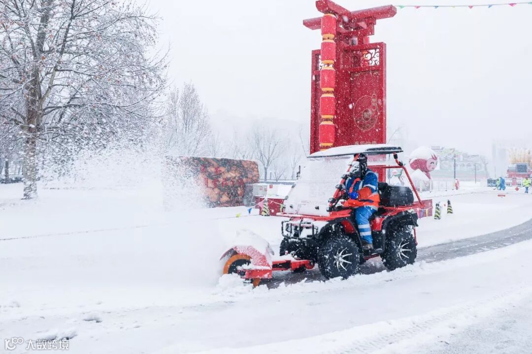 京环绿谷公司环卫工人驾驶扫雪车在世纪广场清理道路积雪,保障市民出行。