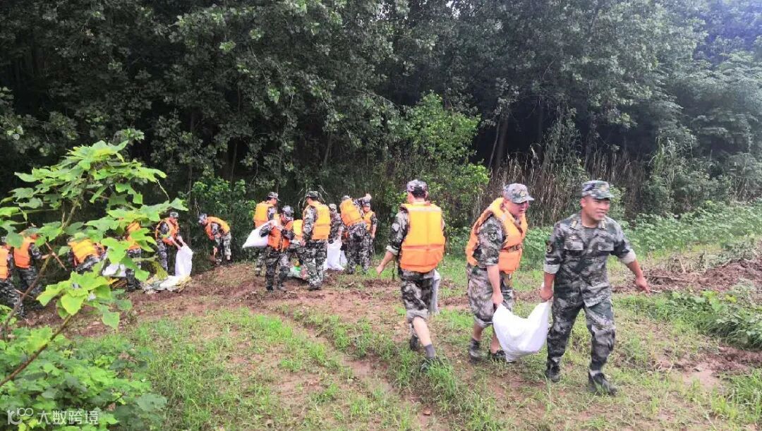 他们火力全开,干劲十足。沙子混着浑浊的雨水,扛在肩上,又湿又重,衣服立马就被浸湿了。一个沙袋重达百余斤,民兵队员们手提肩扛,一个接着一个、一袋接着一袋、一个来回接着一个来回,将沙袋送到堤前,在圩堤前筑起“沙包堡垒”。