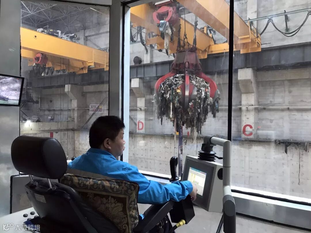 在卸料平台,集装箱式垃圾车开进卸料大厅,垃圾仓的仓门缓缓升起,垃圾随后被送入仓内。经过发酵后,仓内的这些垃圾将被庞大的垃圾吊抓斗输送到焚烧炉内进行焚烧,产生的热能转化成动能发电,最终并入电网。