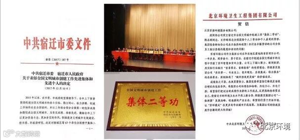 12月10日,江苏省宿迁市召开荣膺全国文明城市庆功大会,北京环卫集团旗下京宿环境公司荣立创文工作集体二等功,公司负责人陈永刚、王作峰分别获得个人三等功和个人嘉奖的荣誉。北京环卫集团党委给京宿环境公司发去贺信,对他们取得的成绩表示肯定,同时要求他们坚持高标准、严要求,努力让“京环模式”在更多的华东城市开花结果。