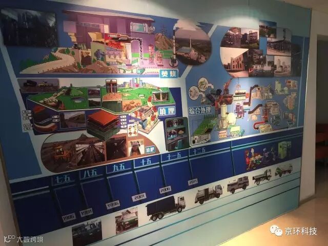 这个大型展板是展示我国垃圾处理技术演变的历史墙。我们国家从上世纪80年代开始有了现代意义上的垃圾处理技术,先后经历了堆肥,卫生填埋,焚烧的历史阶段。然而,人们逐渐意识到,上述任何一种单一的技术都不能实现完整的无害化与资源化处理。因此,近几年来,我国开始探索生活垃圾综合处理技术。