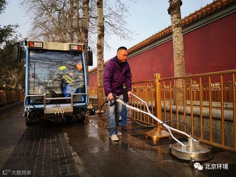 3月12日,北京环卫集团北京机扫公司天安门环境服务中心职工刘宇利用新能源水车配备的圆形磨盘,对西红墙安检通道护栏底部进行磨洗。