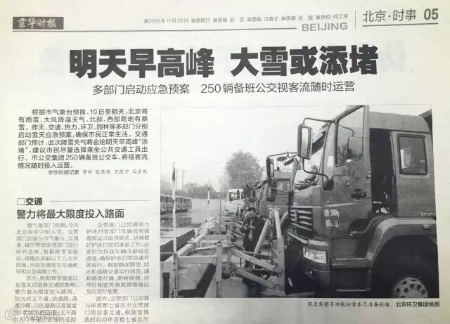 ——11月20日,《北京晨报》在头版对集团应对初雪的各项准备情况进行了报道。