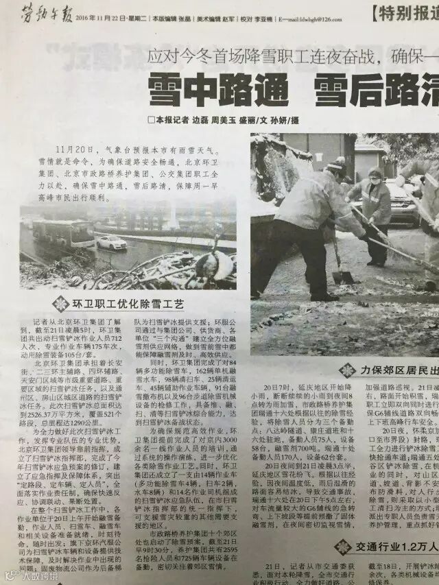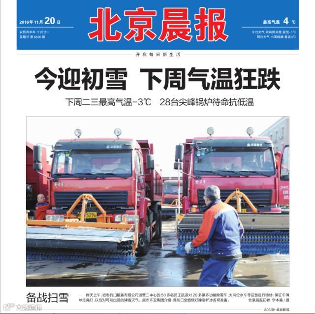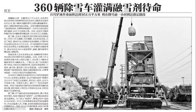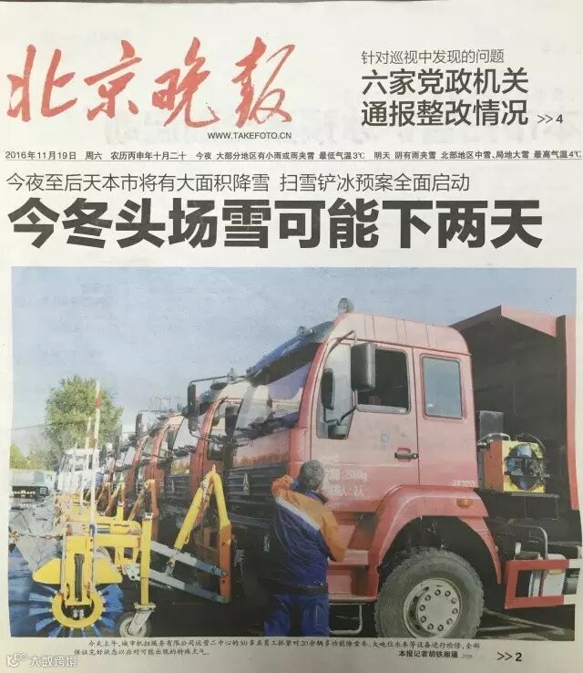 ——11月19日,《北京晚报》在头版刊发北京环卫集团北京机扫公司工人对设备进行检修的照片, 并于22日对扫雪铲冰整体情况进行报道。