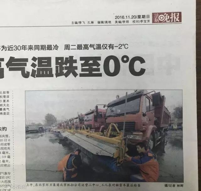 ——11月20日,《法制晚报》刊发了北京环卫集团北京机扫公司运营二中心工人检修融雪车辆的照片。