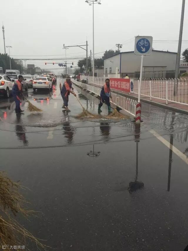 今天清晨,房山公司良乡作业中心清扫班职工清扫道路积水。