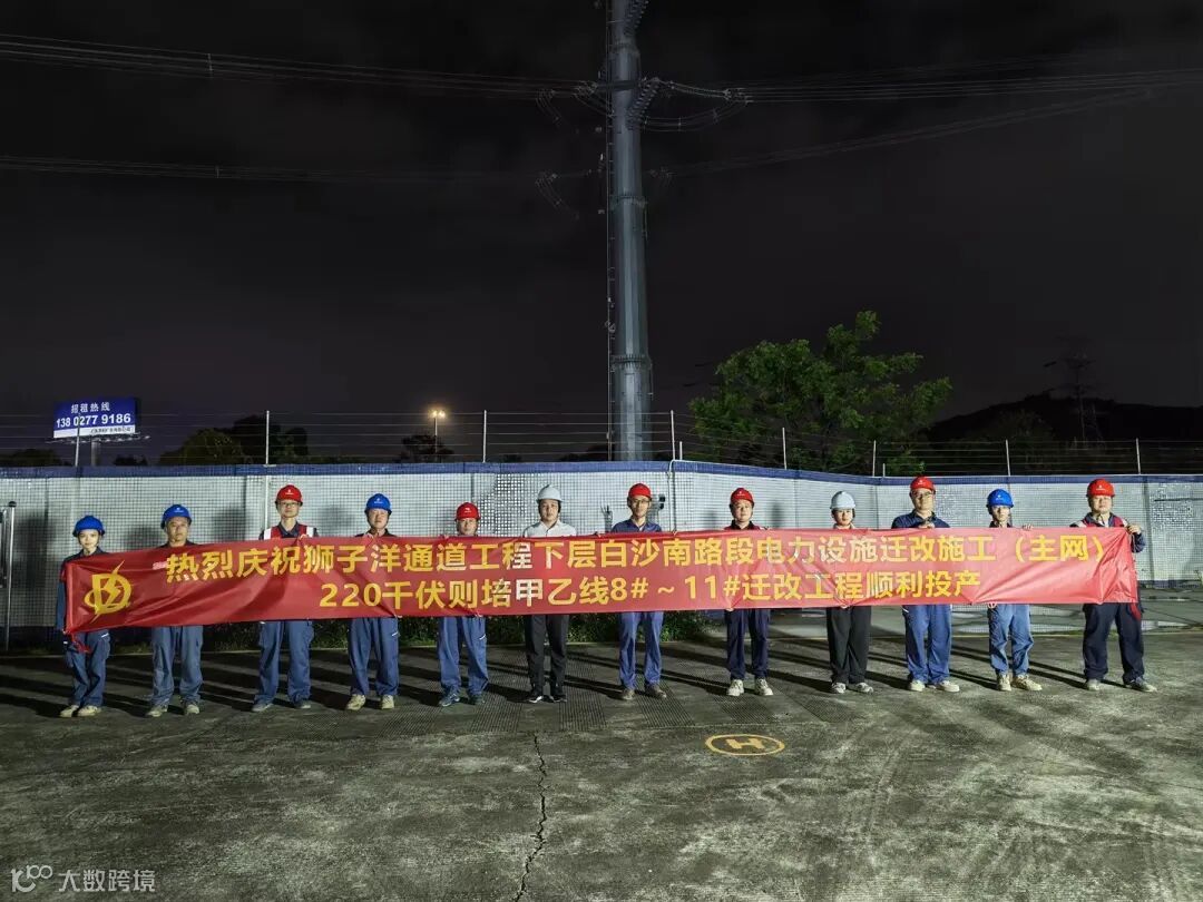 伴随着2026年奋进的号角,3月31日23时03分,狮子洋通道工程下层白沙南路段电力设施迁改施工(主网)220kV则培甲乙线8#~11#迁改工程一次送电成功,一次核相相序正确,线路顺利投运。作为今年首个完成的路桥电力迁改工程,该项目不仅为东莞交控集团重点交通项目——狮子洋通道工程下层白沙南路段扫清了关键瓶颈,更打响了全年电网迁改建设攻坚的“第一枪”。