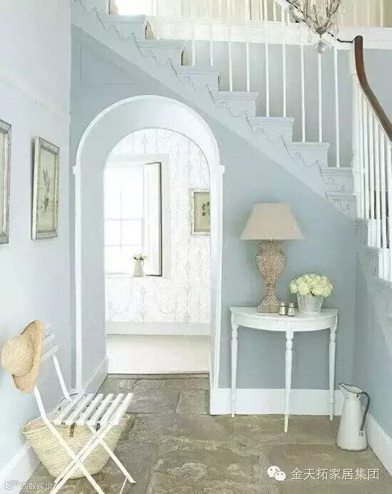 美美的粉蓝色楼梯下玄关,一把白色的椅子,一张半圆形的白色桌子,精致的台灯,淡雅的插花,打造出休闲而梦幻的角落,犹如童话中公主般的城堡般唯美。