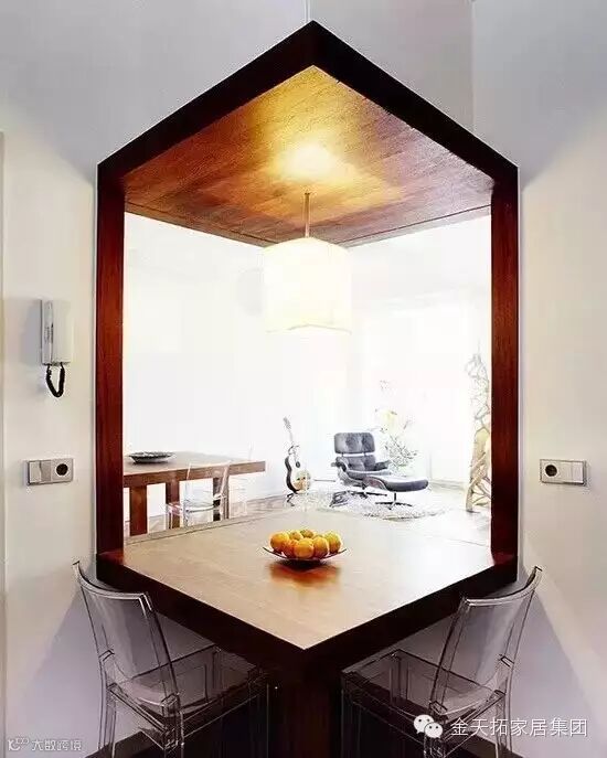 将餐厅角落的墙角设计成一个窗口,把放置一张菱形餐桌,一张餐桌,两个空间都可以用,坐在餐厅,却可以看到另一个空间及户外的美景,别致而独特的角落设计让吃饭的时光也变得额外美丽。