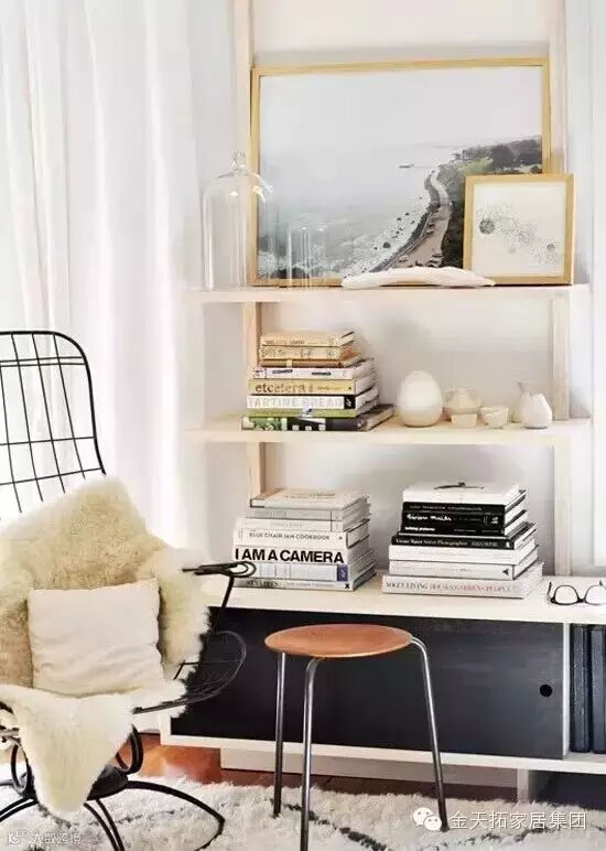 在房间的角落里布置出这样一个安静的阅读空间,简约的原木书架,矮柜也可以当做书桌,铁艺椅子上铺着柔软的毛毯,刚与柔的结合散发着舒服的文艺气息。