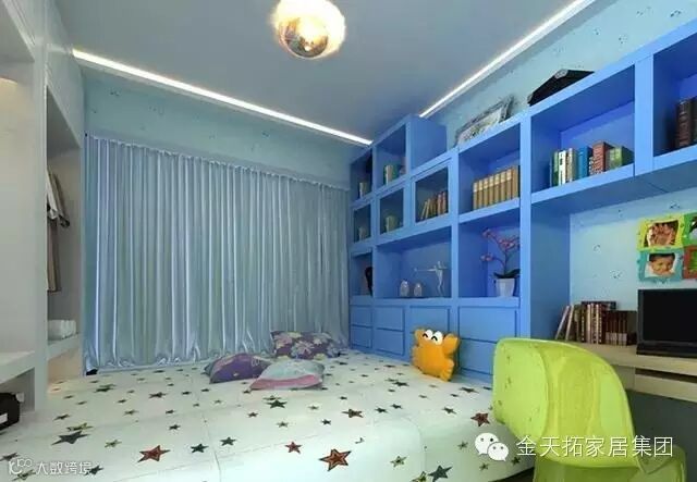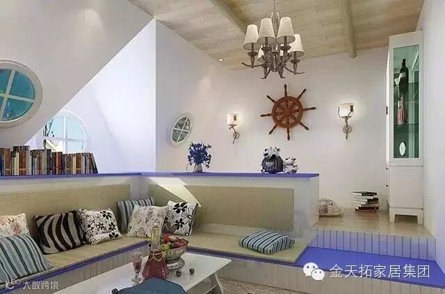 ▲床的前端装上柜子,不仅具有缩小空间占用,还具有强大收纳功能。蓝白地中海色彩相间,颇具有异域风情。