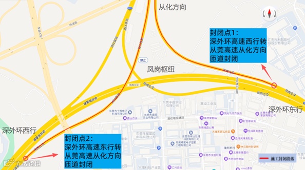 封闭点1:凤岗枢纽深外环高速西行转从莞深高速从化方向匝道实行全封闭交通管制;