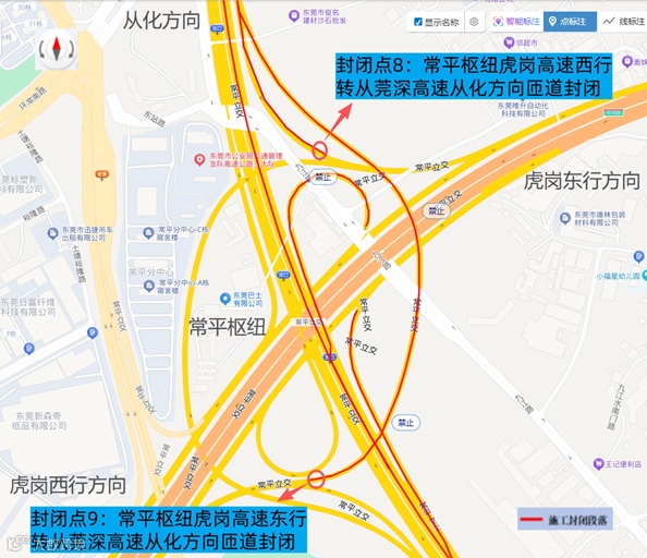封闭点8:常平枢纽虎岗高速西行转从莞深高速从化方向匝道实行全封闭交通管制。
